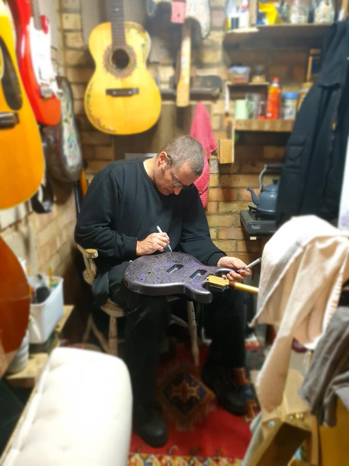 So now I work with my lifelong friend and cousin Karl Bailey, whom I laughingly call ‘the artwork department’ and we build, repair, and craft exceptional, handmade guitars together.